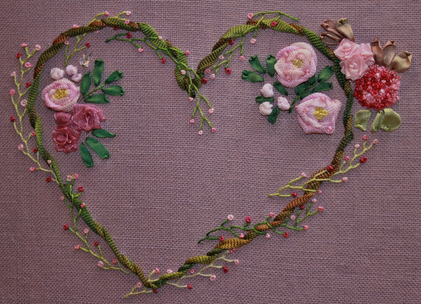 Durant une journée de stage, vous pourrez apprendre à réaliser un coeur en broderie au ruban, avec différents points pour les fleurs et les feuilles : le point avant surjeté, le point d’épines, le point de noeud, le point d’araignée, le point de rose, le point de ruban.